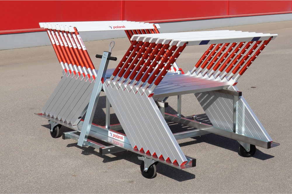 - Optimized capacity and maneuverability - depending on hurdle type (square or round foot), each cart carries between 10 and 22 hurdles, covering one or two lanes. With a set of four carts, hurdles can be deployed across the track in one or two quick runs.