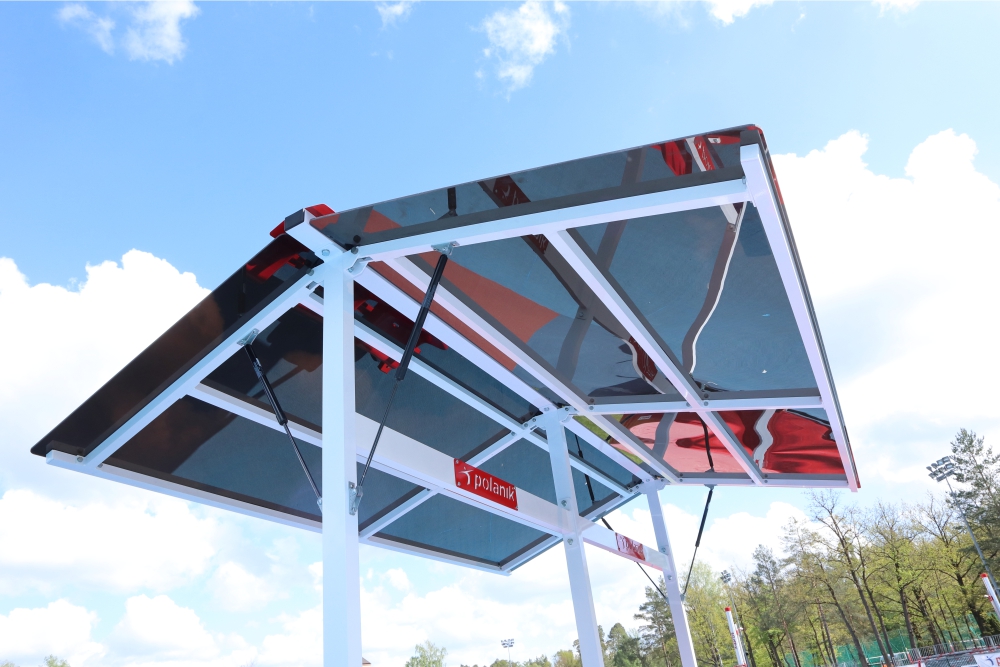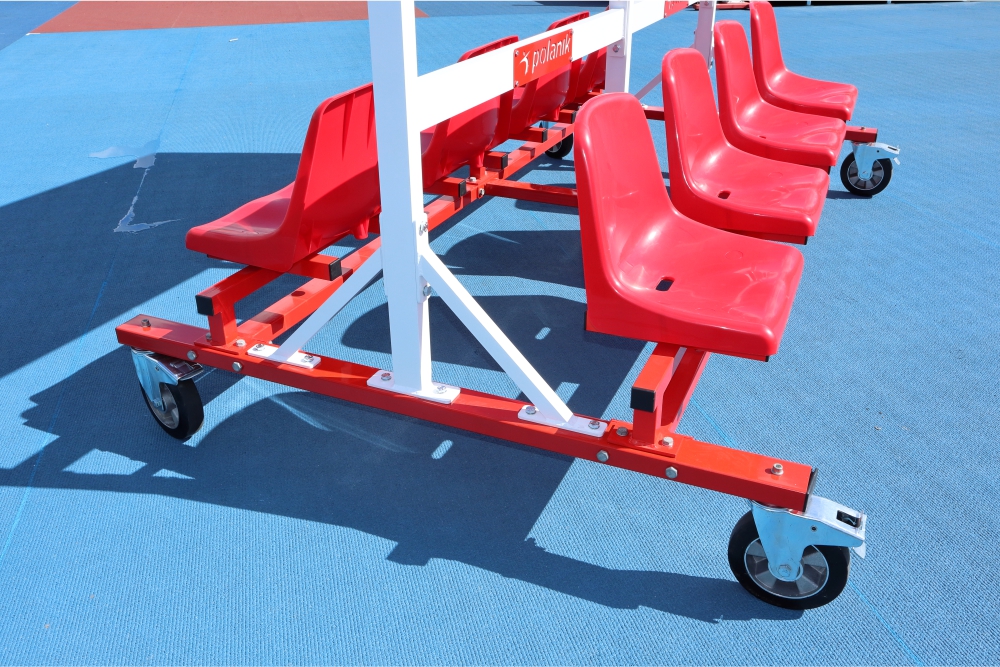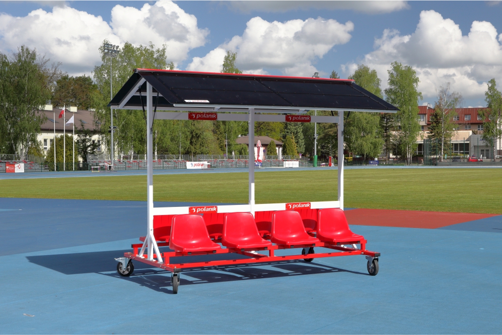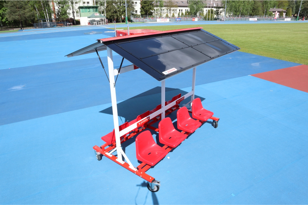 Shelter is intended for use on the infield of an athletics stadium during training sessions and technical field events. The main purpose of the shelter is to provide optimal conditions for athletes who are preparing for their attempt while waiting for their turn. The shelter is a place where they can rest comfortably, seated in a shaded area.